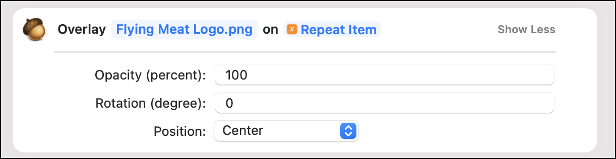 Click on the blue text titled "Overlay Image" in the Overlay action. Select an image to use for a watermark. This example uses the Flying Meat logo. If you don't have a logo, you can use this one: Flying Meat Watermark.png