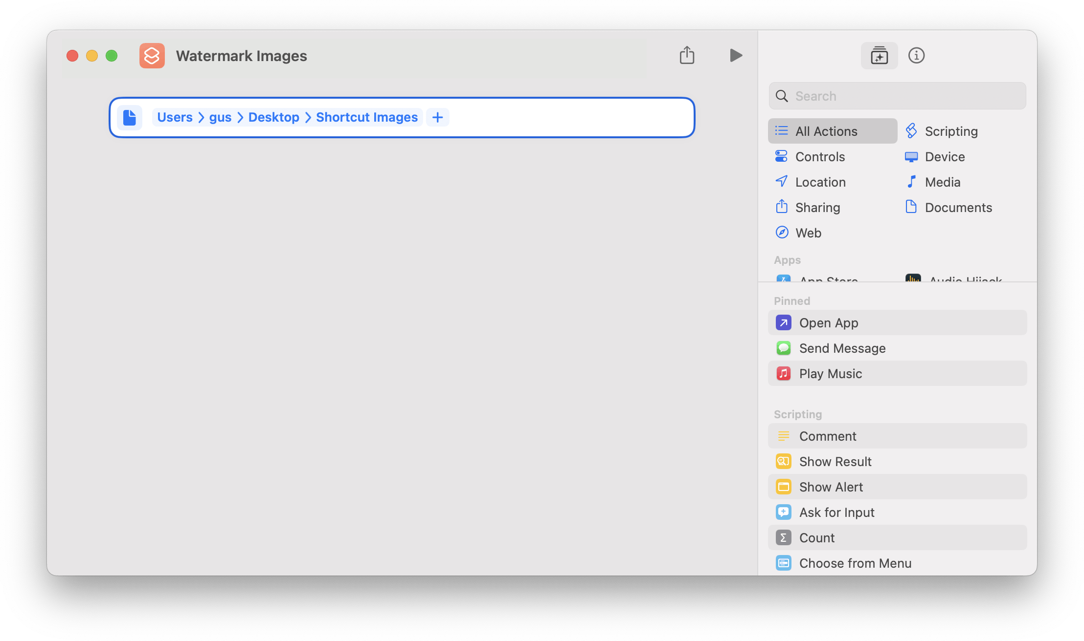 To start, open the Shortcuts app. Create a new shortcut via the File ▸ New Shortcut menu item. An empty window will appear. Click in the title bar and choose a name if desired, "Watermark Images" is used here.