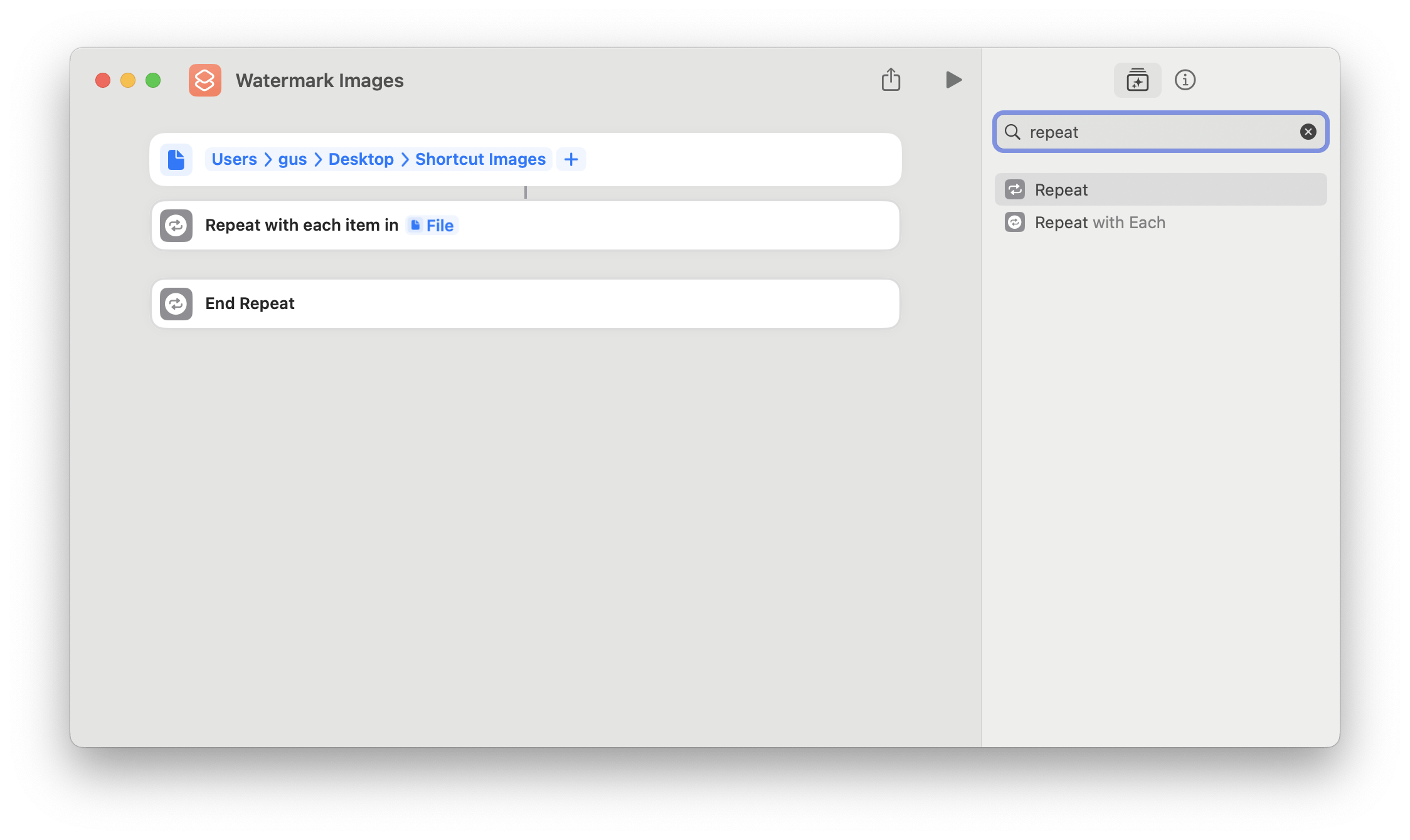 Add the "Repeat with Each" action. Enter the word "repeat" in the search field of Shortcuts to locate it. Drag and drop or double click on 'Repeat with Each' to add it to the action area.