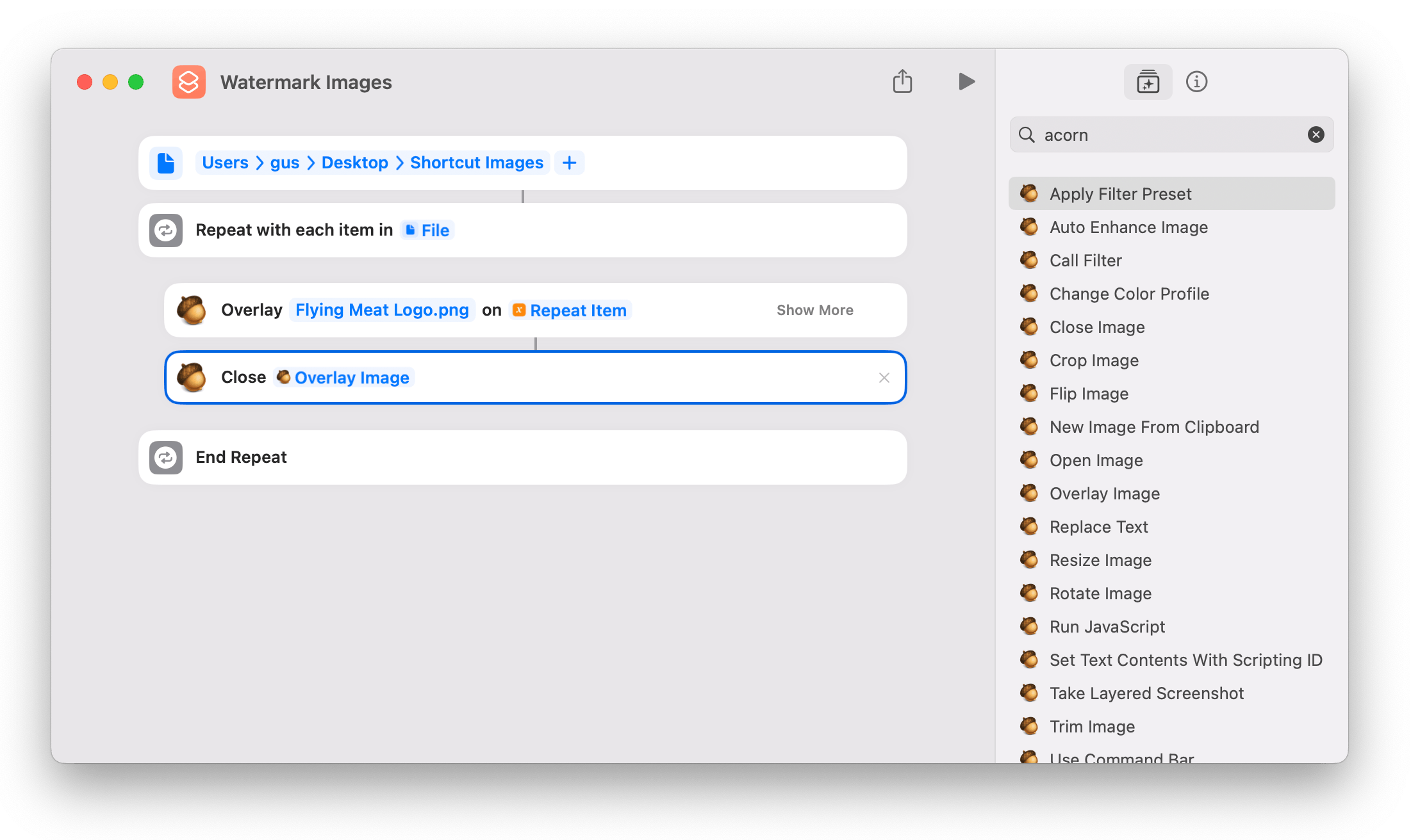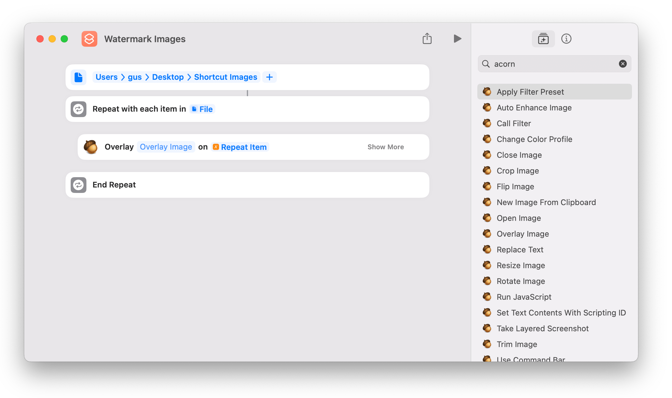 Perform a search for "acorn" in the Shortcuts search field. A list of various actions from Acorn will appear. Locate the one titled "Overlay Image" and drag and drop that between the "Repeat" and "End Repeat" actions.