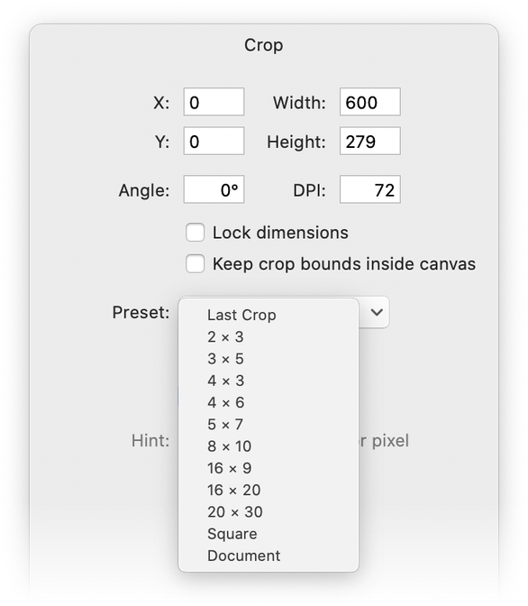 Acorn provides preset cropping choices which are useful if you want your image cropped to a standard width and height.
