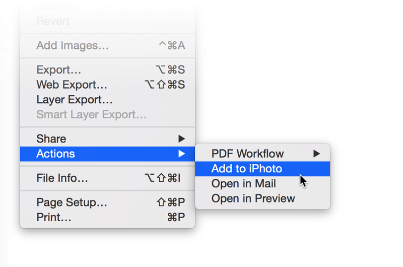 You can set up file actions for images that you are working on in Acorn. File actions will take your image out of Acorn and into another application. The actions that come pre-installed include PDF Workflow, Add to iPhoto, Open in Mail, and Open in Preview. To access this feature, navigate to File āø Actions.