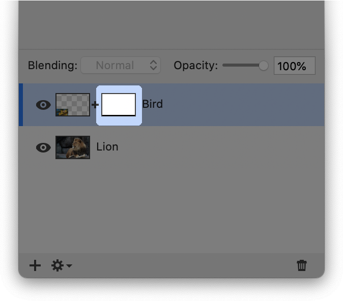 In layer masks, black that is drawn or painted on the mask hides pixels in the linked layer thus exposing the layer below in those areas. In this example the bird layer has the layer mask, and the lion is in the layer below. By selecting a brush and the color black, the bird's background can appear to be removed by drawing on the layer mask.