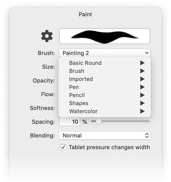 If you click on the brush drop down menu, a list will appear for selecting different types of preset brushes. You can select from brushes, pens, pencils, and more.