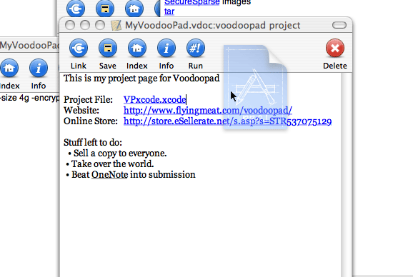 Drag and drop files, urls, and images straight into VoodooPad. Click on the link and be taken to the content it's linked to.