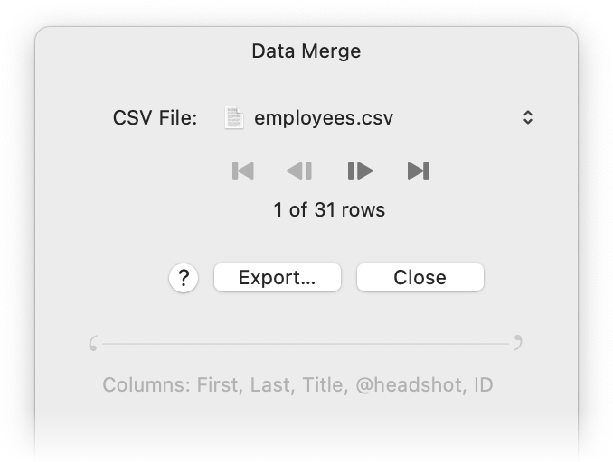 Almost all of the column fields have been assigned to text boxes. But what about the @headshot column in the spreadsheet? That's already been assigned in the template, as one of the layers has the name "@headshot". When Acorn comes across that column it'll look for a corresponding bitmap layer name and swap in the referenced image.